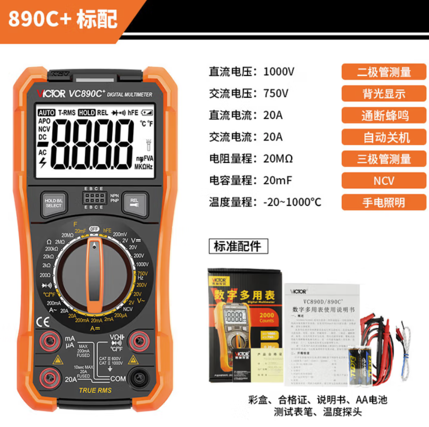 胜利仪器(VICTOR)数字万用表高精度型电工万能表智能家用 带测温 VC890C+